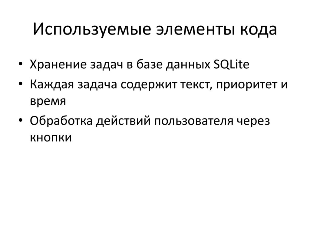 Используемые элементы кода• Хранение задач в базе данных SQLite