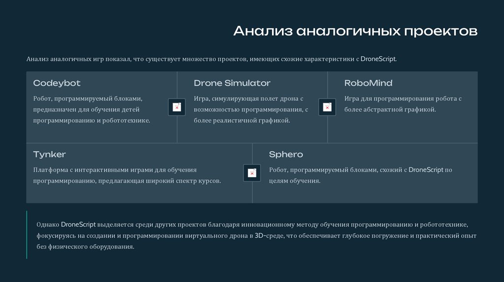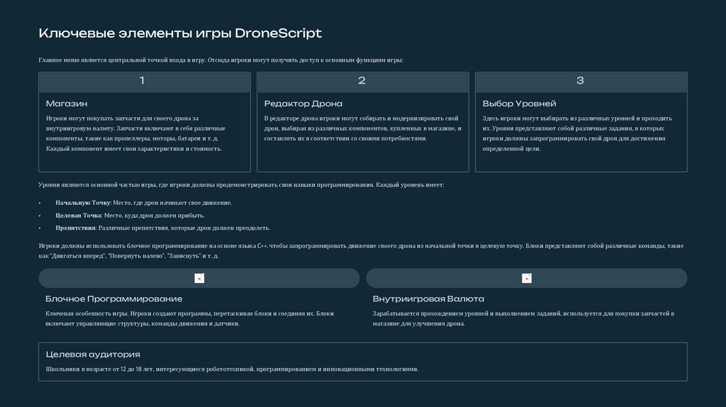Разработка концепции и проектного предложенияИгра предназначена для ознакомления школьников с концепцией беспилотных дронов и основами программирования. Игра разработана для школ, не имеющих возможности