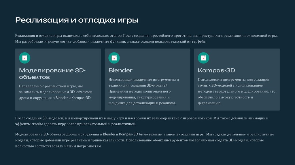 модели, которые добавили игре реализма и привлекательности. Использование обоих инструментов позволило нам создать 3D-модели, которые