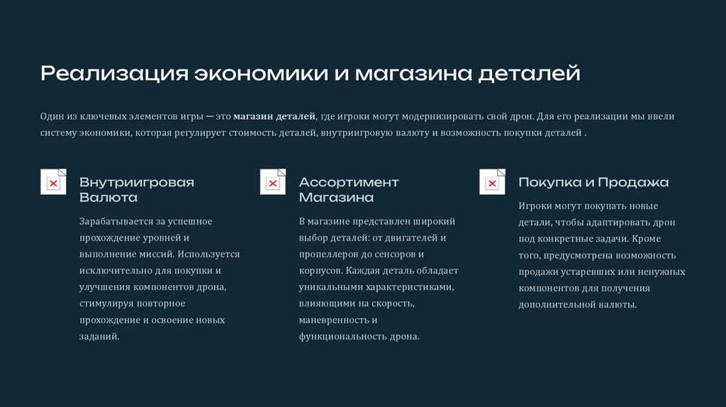 Реализация экономики и магазина деталейОдин из ключевых элементов игры — это магазин деталей, где игроки могут модернизировать свой дрон. Для его реализации мы ввели