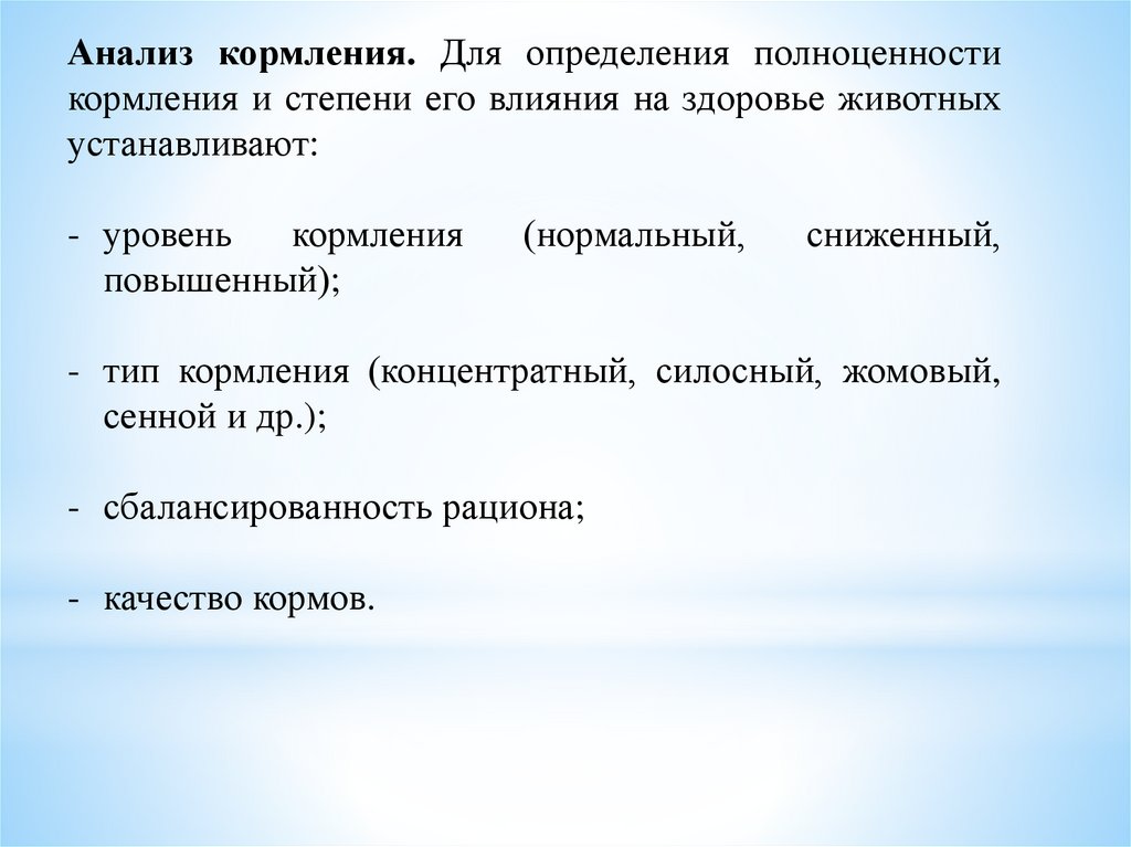 Анализ кормления. Для определения полноценностикормления и степени его влияния на здоровье животных