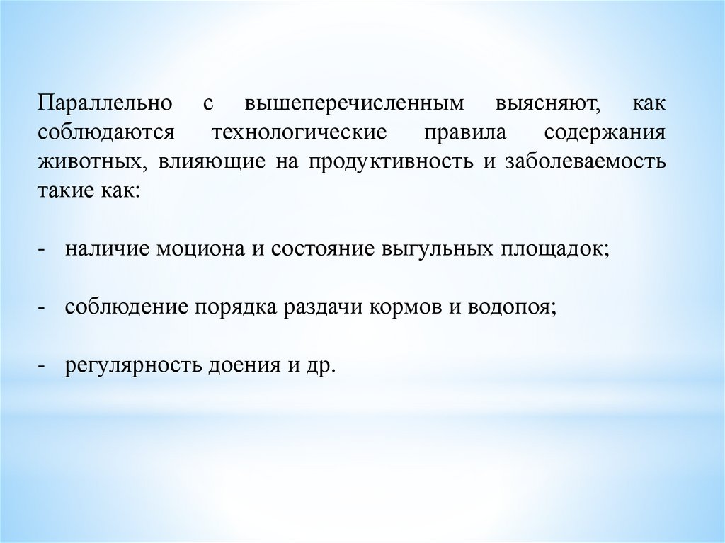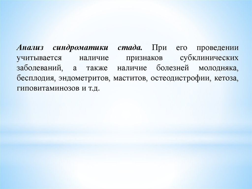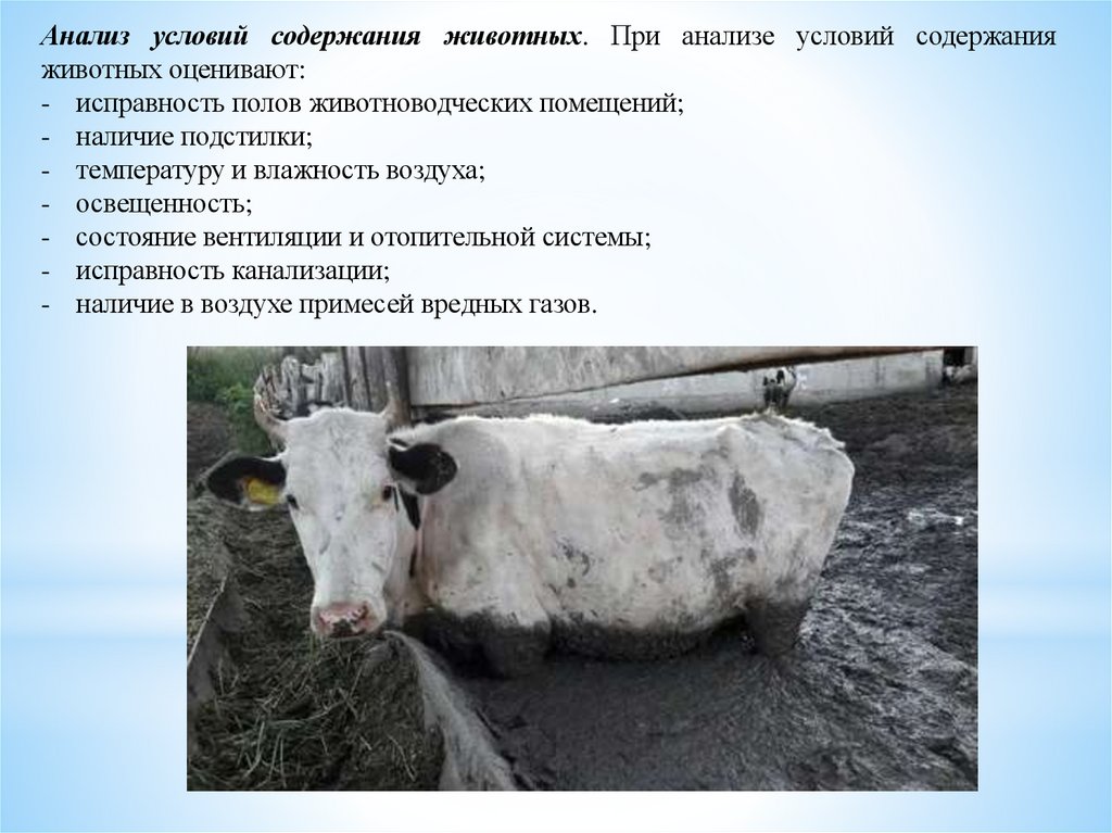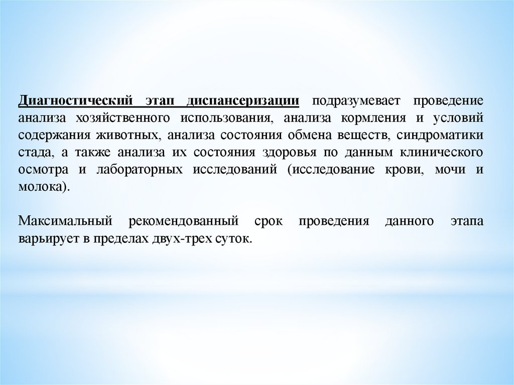 Диагностический этап диспансеризации подразумевает проведениеанализа хозяйственного использования, анализа кормления и условий