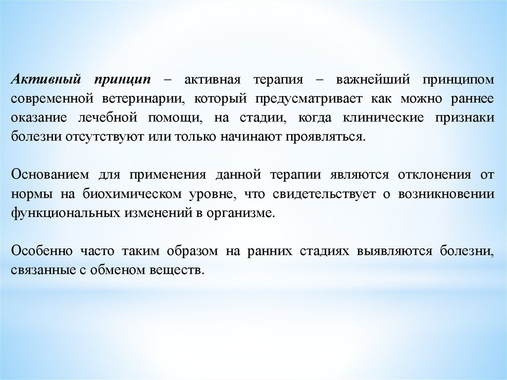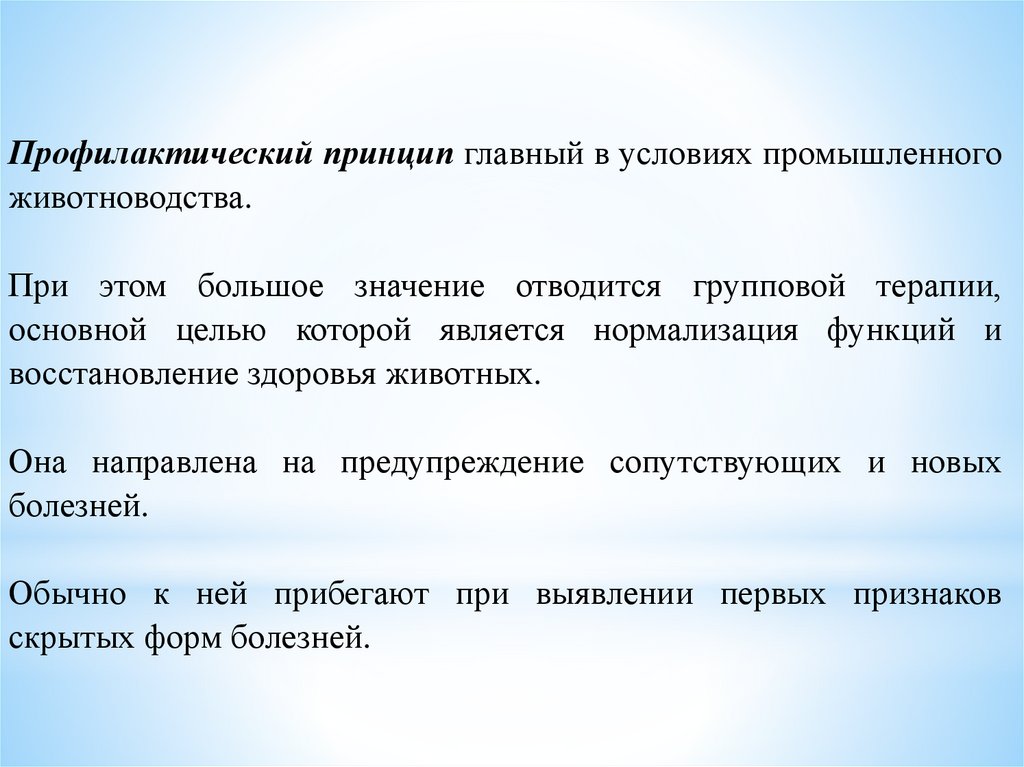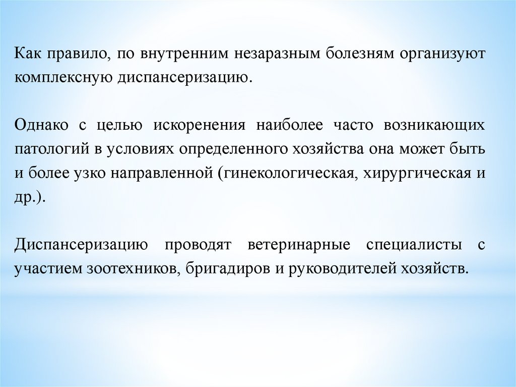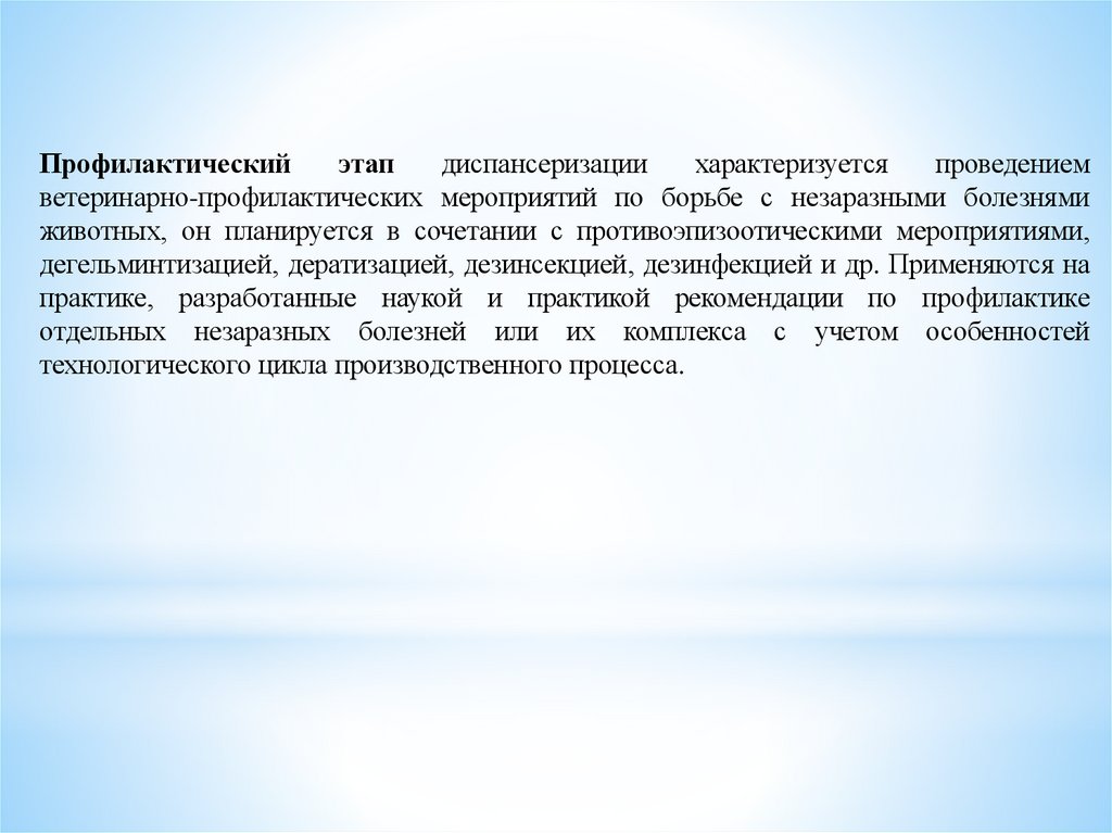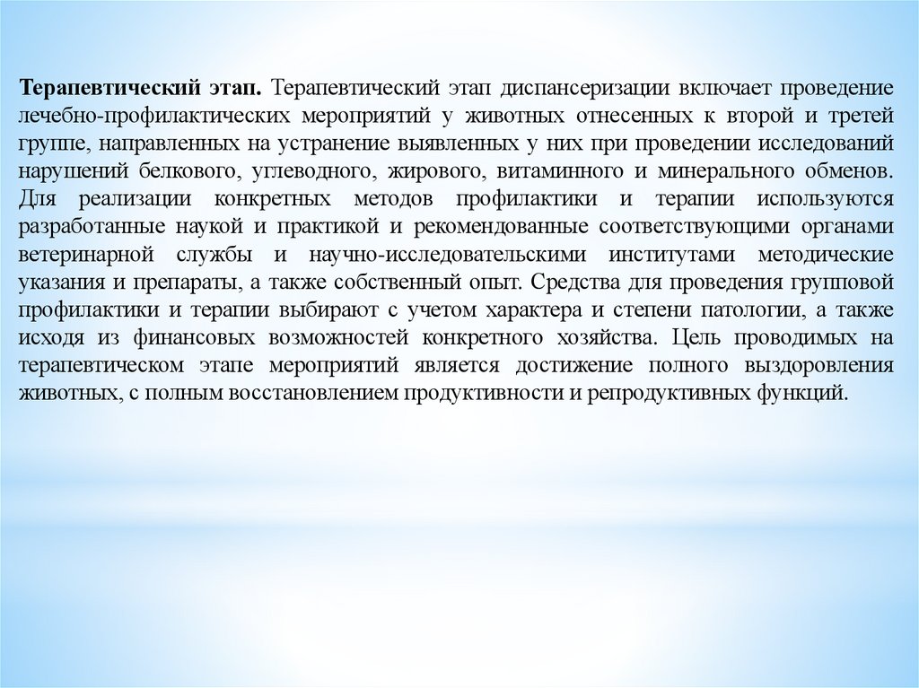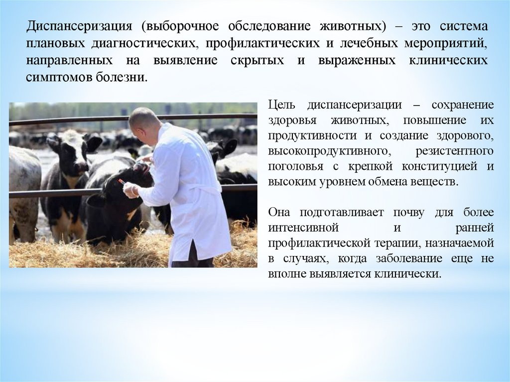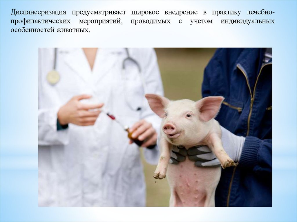 Диспансеризация предусматривает широкое внедрение в практику лечебнопрофилактических мероприятий, проводимых с учетом индивидуальныхособенностей животных.