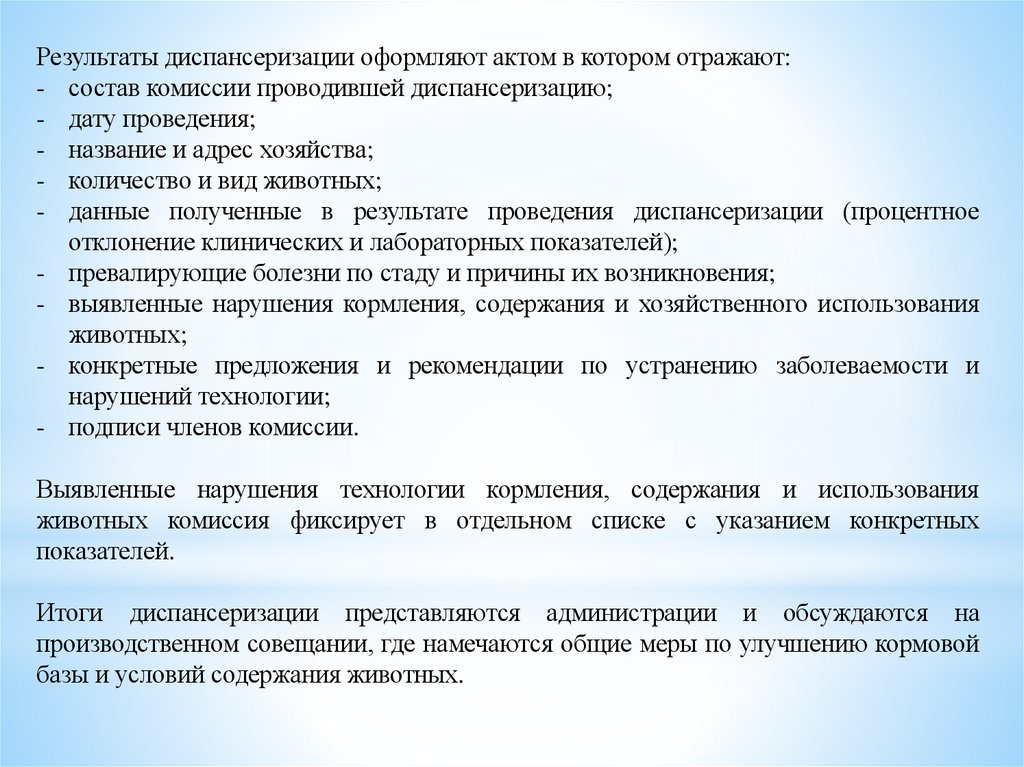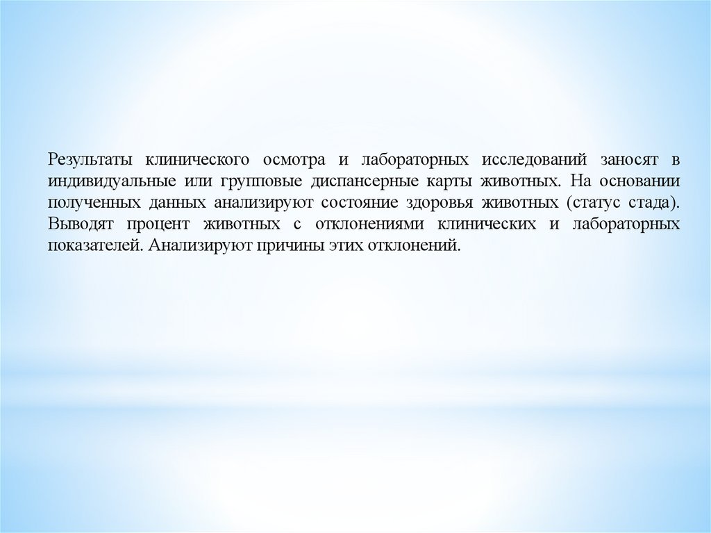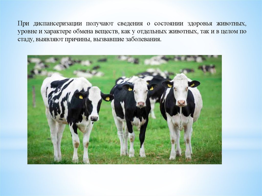 При диспансеризации получают сведения о состоянии здоровья животных,уровне и характере обмена веществ, как у отдельных животных, так и в целом по