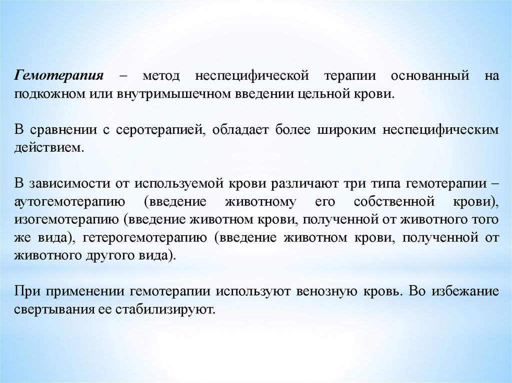Гемотерапия – метод неспецифической терапии основанныйподкожном или внутримышечном введении цельной крови.
