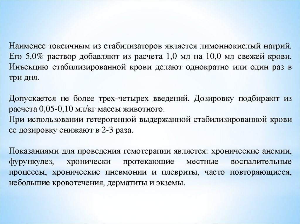 Наименее токсичным из стабилизаторов является лимоннокислый натрий.Его 5,0% раствор добавляют из расчета 1,0 мл на 10,0 мл свежей крови.