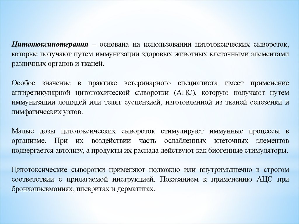 Цитотоксинотерапия – основана на использовании цитотоксических сывороток,которые получают путем иммунизации здоровых животных клеточными элементами