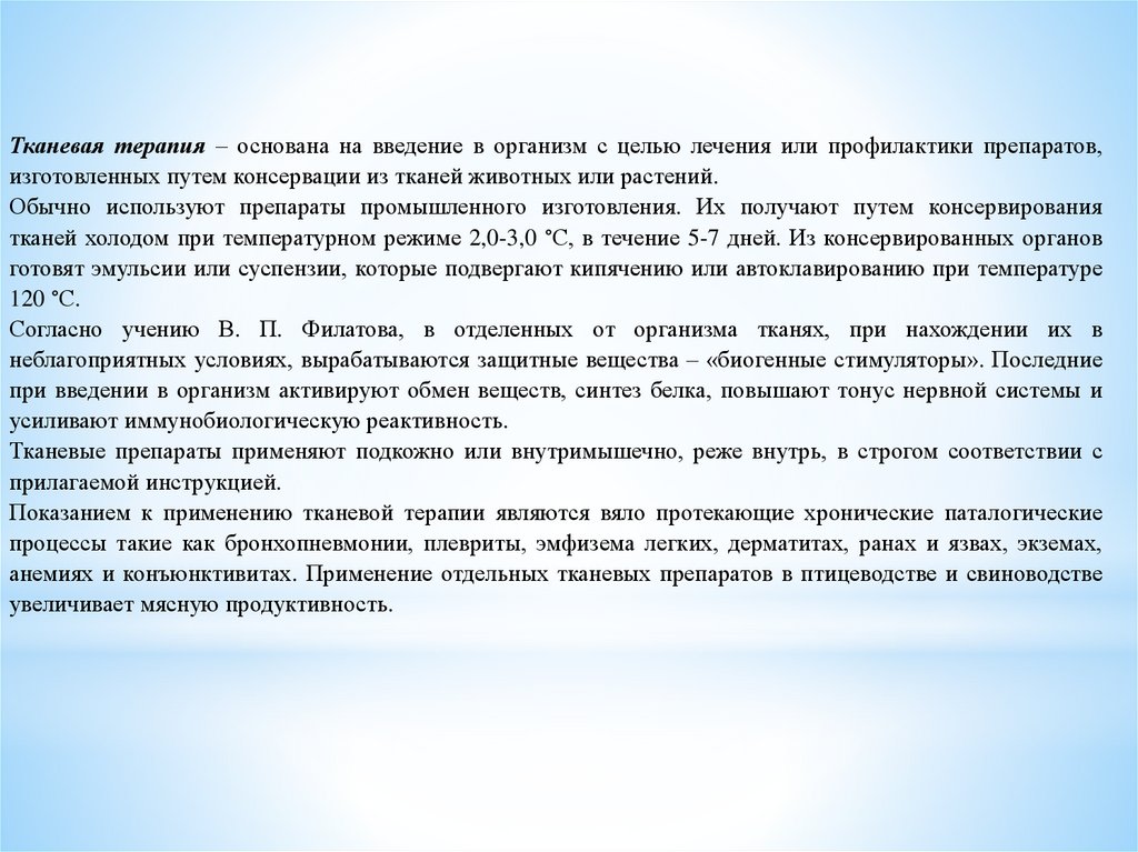 Тканевая терапия – основана на введение в организм с целью лечения или профилактики препаратов,изготовленных путем консервации из тканей животных или растений.