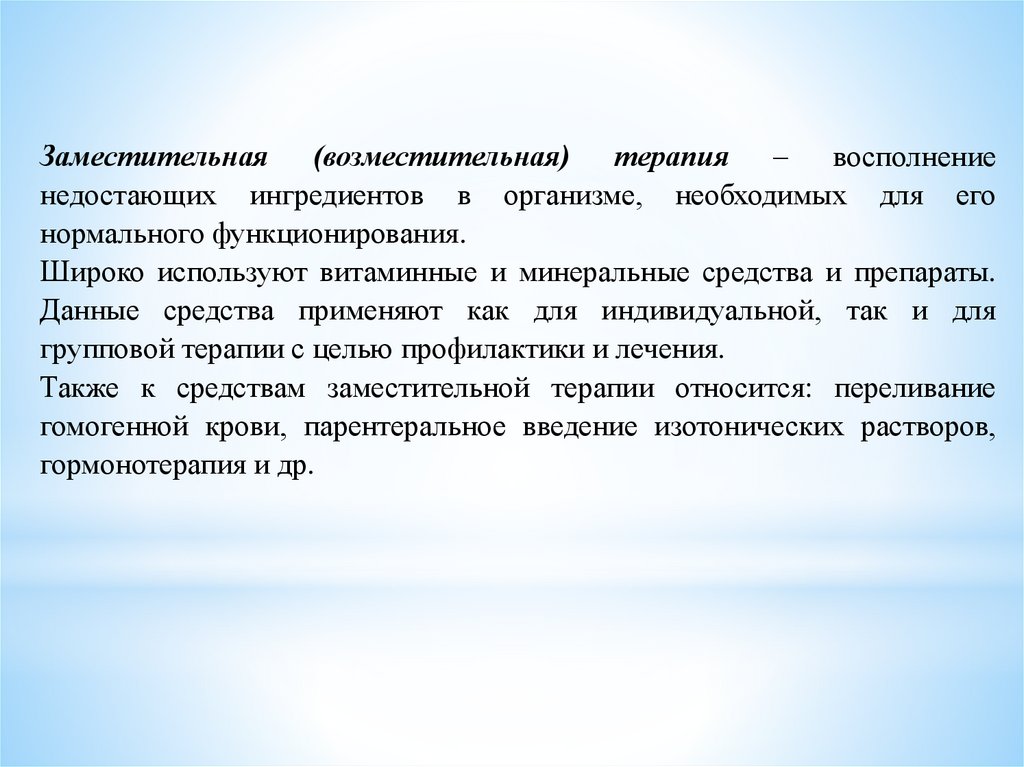 Заместительная (возместительная) терапия – восполнениенедостающих ингредиентов в организме, необходимых для его