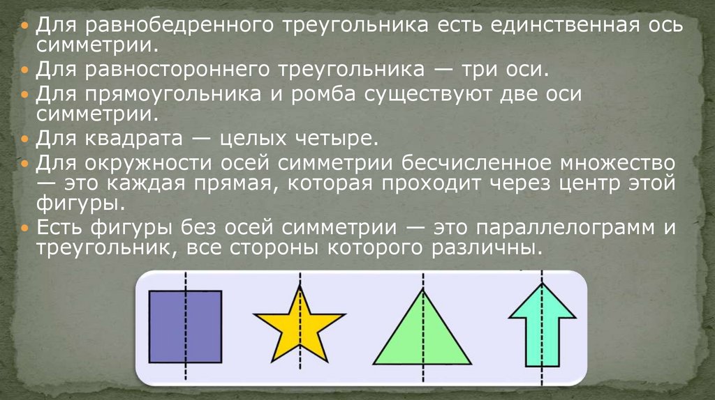 Для равнобедренного треугольника есть единственная осьсимметрии.