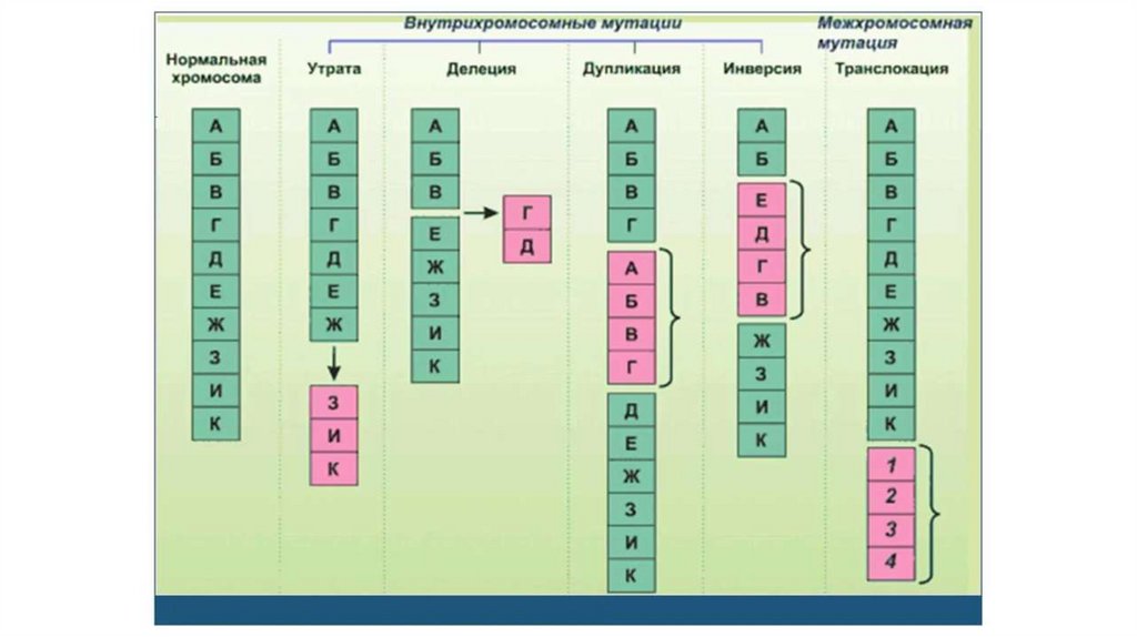 Хромосомные• В результате хромосомных мутаций происходят структурные