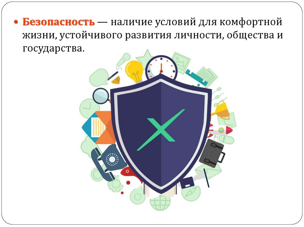 Безопасность — наличие условий для комфортнойжизни, устойчивого развития личности, общества и