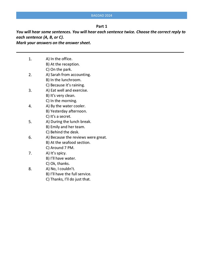 You will hear some sentences. You will hear each sentence twice. Choose the correct reply to