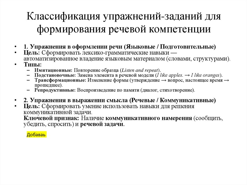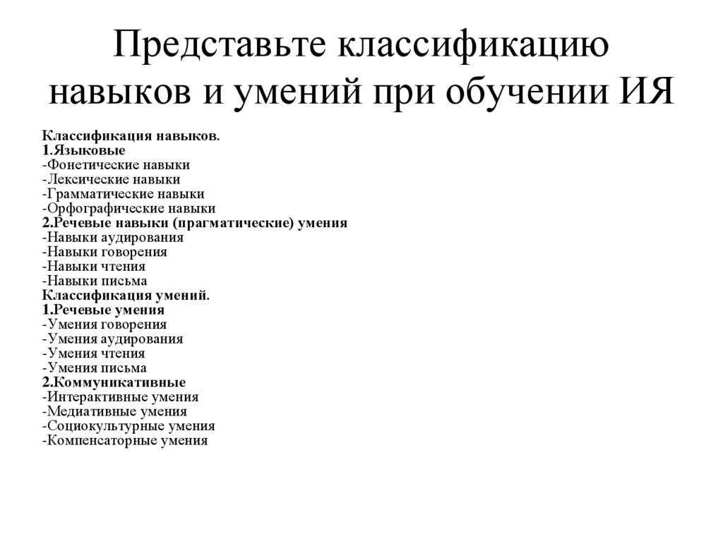 Представьте классификациюнавыков и умений при обучении ИЯ