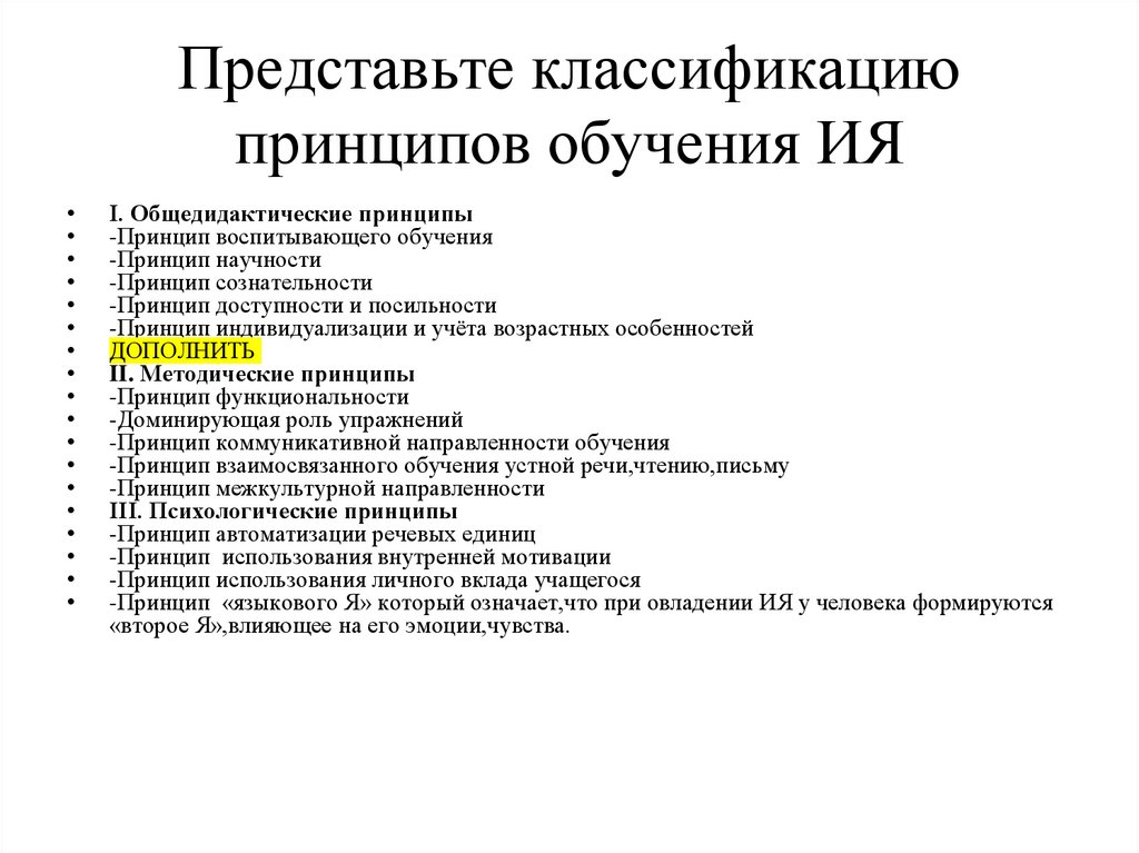 Представьте классификациюпринципов обучения ИЯ