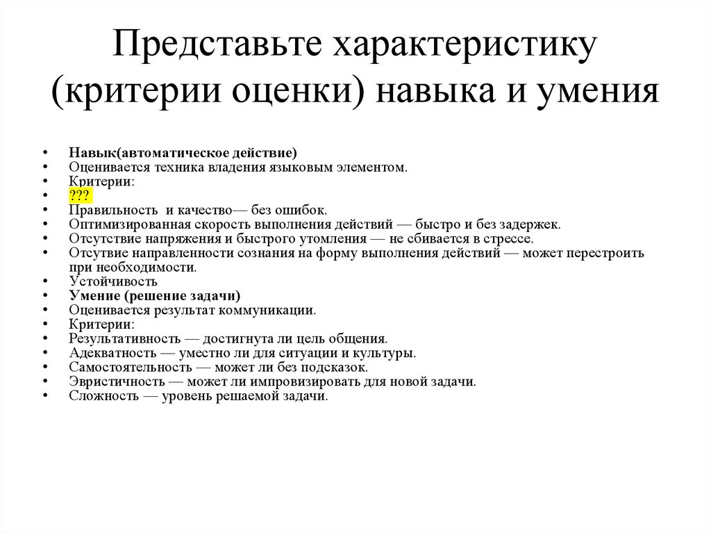 Представьте характеристику(критерии оценки) навыка и умения