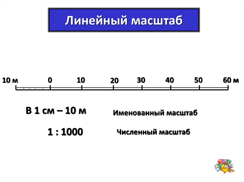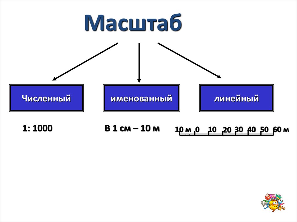 3. Масштаб показывает, во сколько раз каждая линия, нанесённая на план (карту), меньше по отношению к её действительным размерам