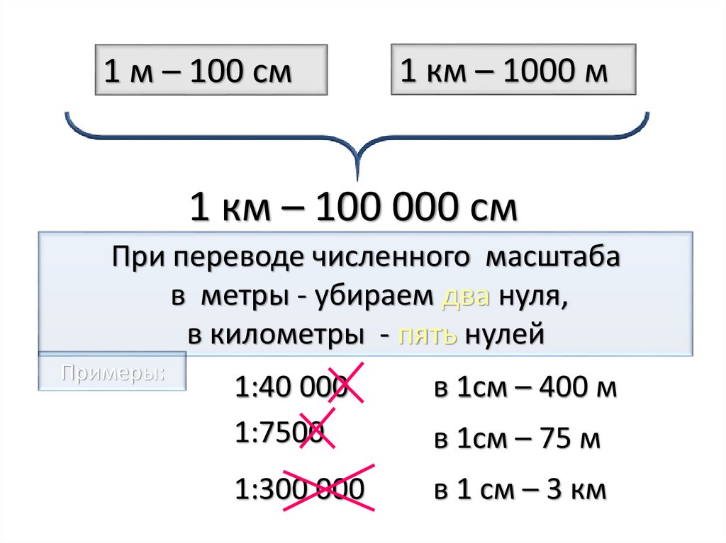 • в 1 см – 1000 м или 1 км