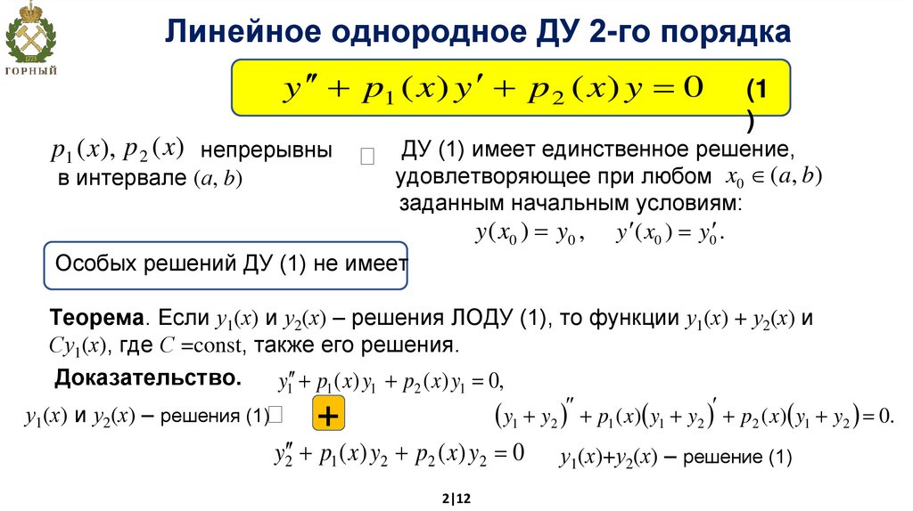 Линейное однородное ДУ 2-го порядкаy p1 ( x ) y p 2 ( x ) y 0