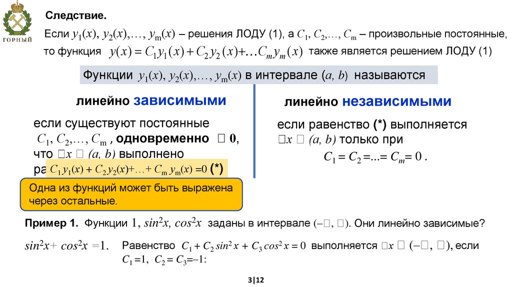 Пример 1. Функции 1, sin2х, cos2х заданы в интервале (– ,