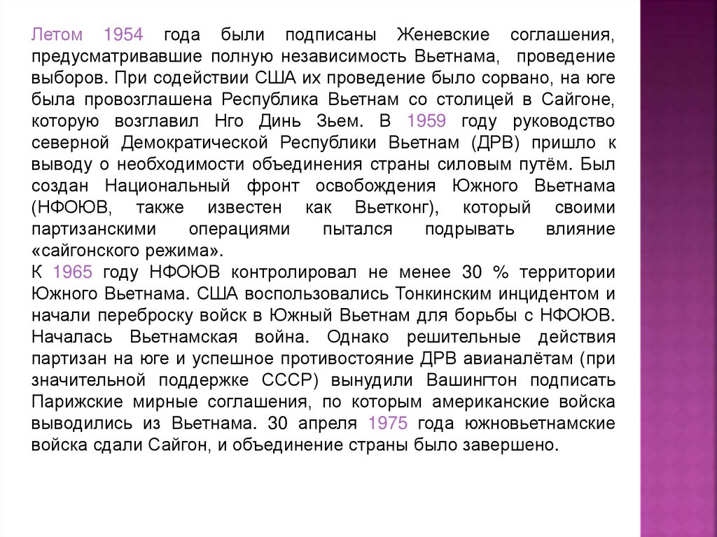 Летом 1954 года были подписаны Женевские соглашения,предусматривавшие полную независимость Вьетнама, проведение
