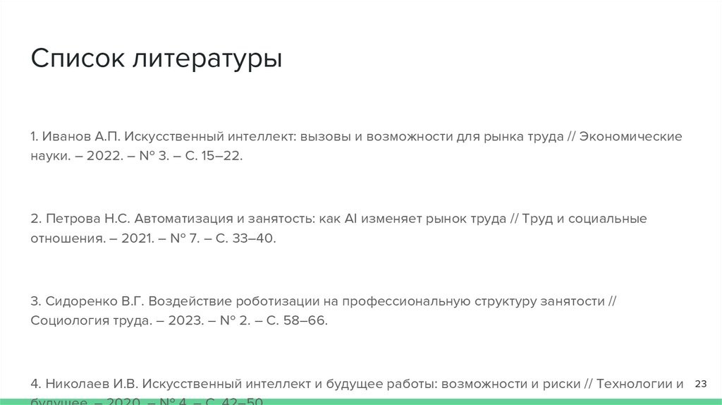 Список литературы1. Иванов А.П. Искусственный интеллект: вызовы и возможности для рынка труда // Экономические