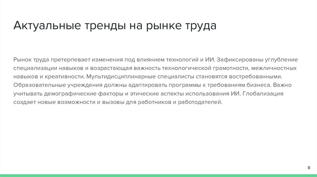 Актуальные тренды на рынке трудаРынок труда претерпевает изменения под влиянием технологий и ИИ. Зафиксированы углубление