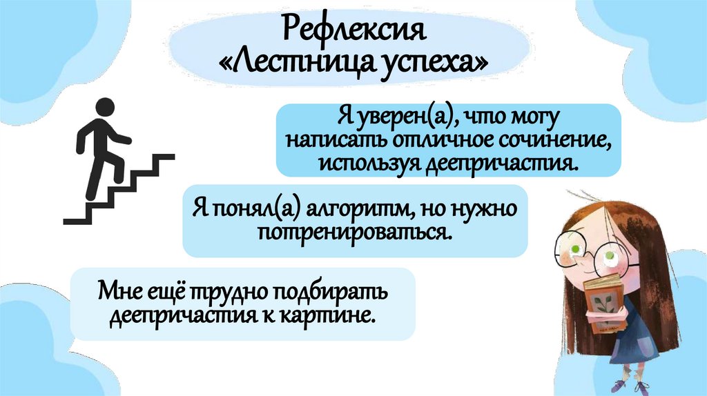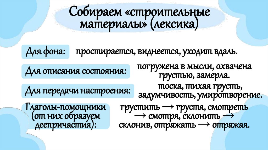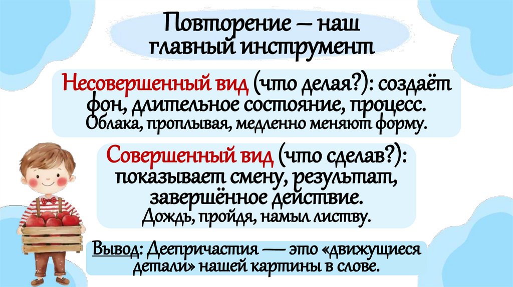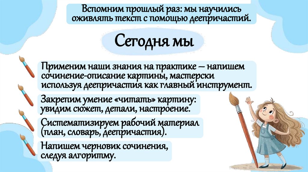 Вспомним прошлый раз: мы научилисьоживлять текст с помощью деепричастий.