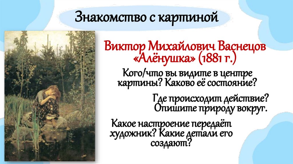 Васнецова «Алёнушка». Вглядываясь в полотно,