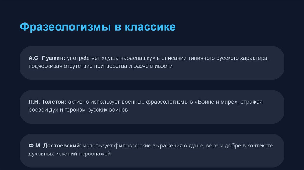 Фразеологизмы в классикеА.С. Пушкин: употребляет «душа нараспашку» в описании типичного русского характера,