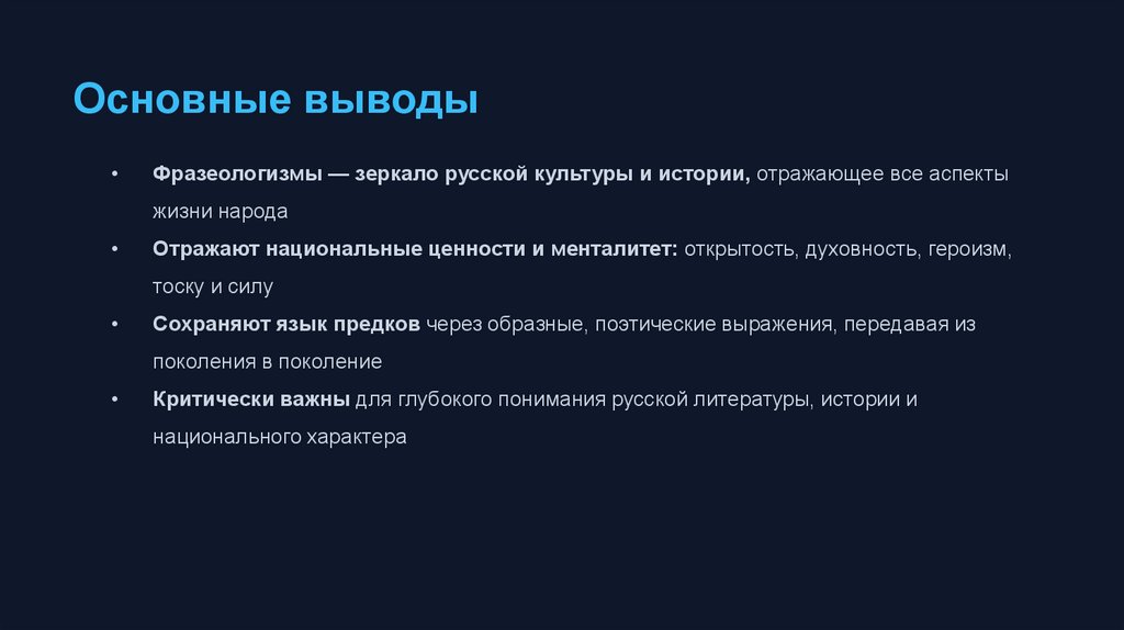 Основные выводыФразеологизмы — зеркало русской культуры и истории, отражающее все аспекты