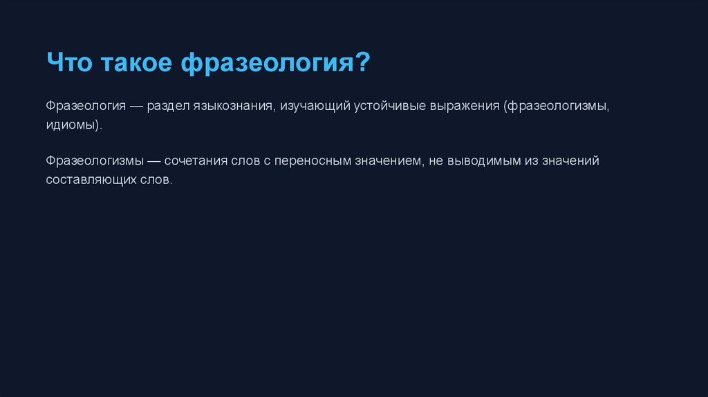 Что такое фразеология?Фразеология — раздел языкознания, изучающий устойчивые выражения (фразеологизмы,
