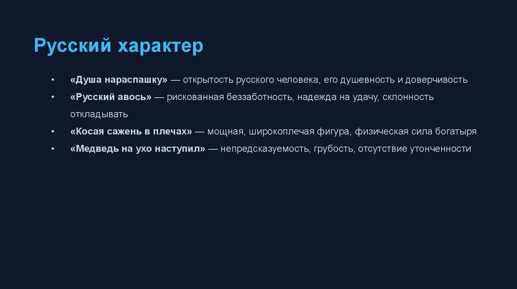 Русский характер«Душа нараспашку» — открытость русского человека, его душевность и доверчивость