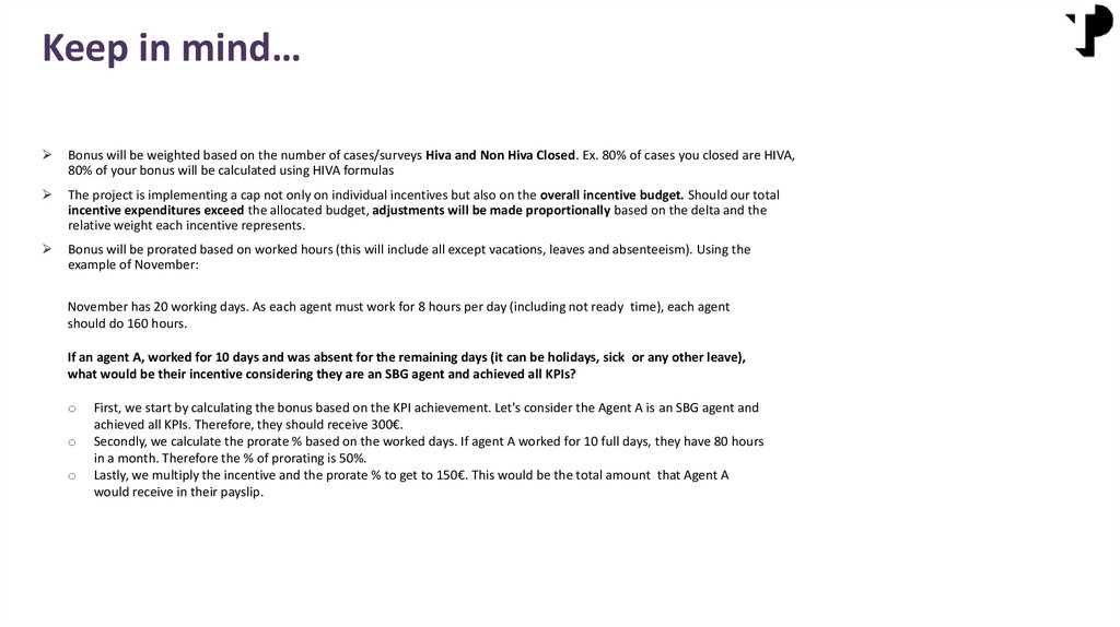 Lastly, we multiply the incentive and the prorate % to get to 150€. This would be the total amount that Agent A