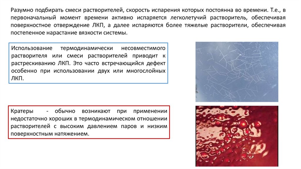 Разумно подбирать смеси растворителей, скорость испарения которых постоянна во времени. Т.е., впервоначальный момент времени активно испаряется легколетучий растворитель, обеспечивая