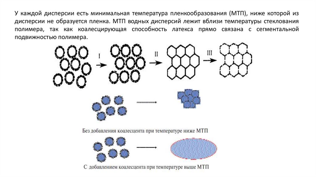 У каждой дисперсии есть минимальная температура пленкообразования (МТП), ниже которой издисперсии не образуется пленка. МТП водных дисперсий лежит вблизи температуры стеклования