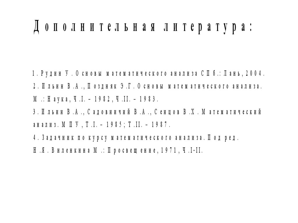 Д ополни тельная ли тература:1 . Р у д и н У . О с н о в ы м а т е м а т и ч е с к о г о а н а л и з а С П б .: Л а н ь , 2 0 0 4 .