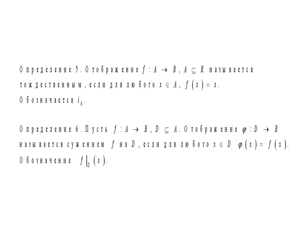 О п ред елен и е 5. О тоб раж ен и е f : A B , A R н азы ваетсято ж д ествен н ы м , есл и д л я л ю б о го x A , f x x.