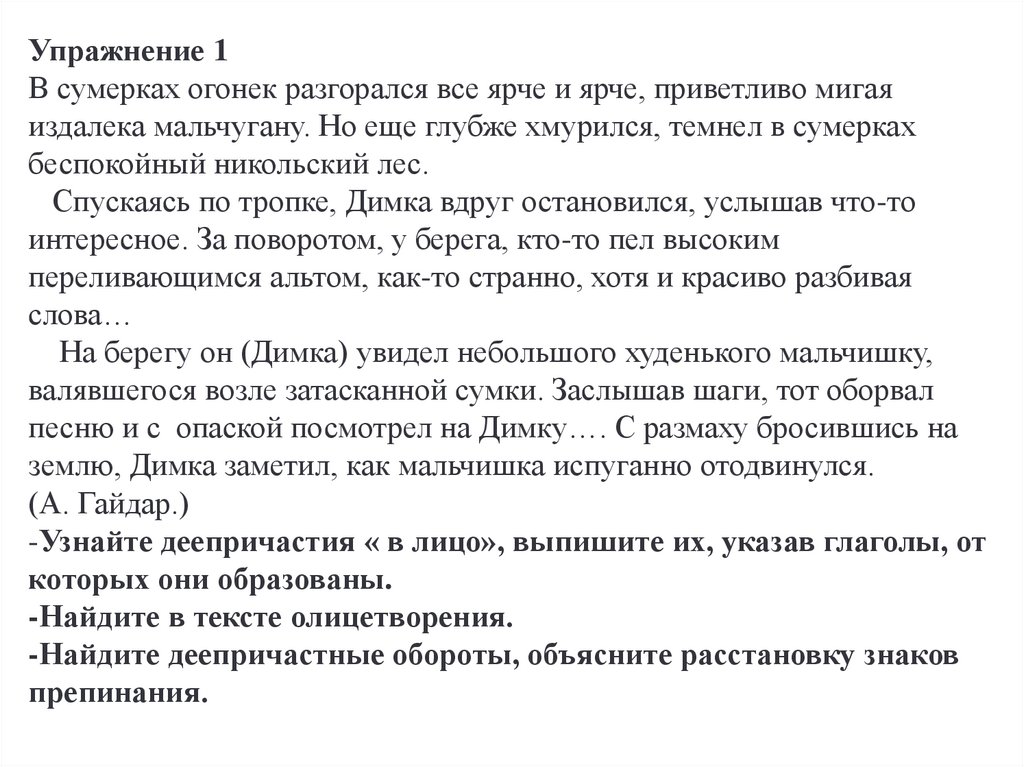 1. Упражнение 1 В сумерках огонек разгорался все ярче и ярче, приветливо мигая издалека мальчугану. Но еще глубже хмурился, темнел