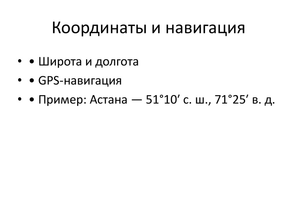 • • Пример: Астана — 51°10′ с. ш., 71°25′ в. д.