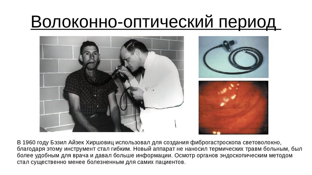 Волоконно-оптический периодВ 1960 году Бэзил Айзек Хиршовиц использовал для создания фиброгастроскопа световолокно,
