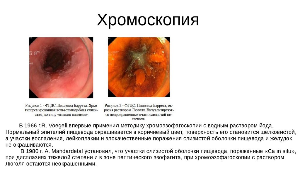 ХромоскопияВ 1966 г.R. Voegeli впервые применил методику хромоэзофагоскопии с водным раствором йода.