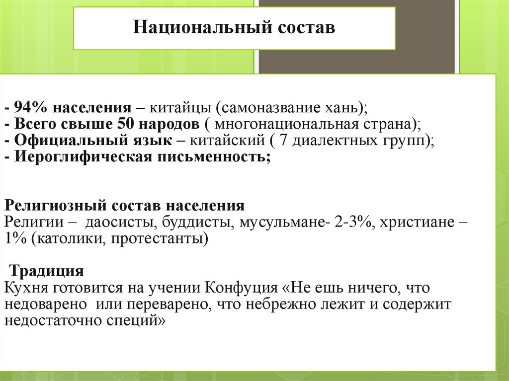 94 % - китайцы (ханьцы)сино –тибетская семья50% горожане