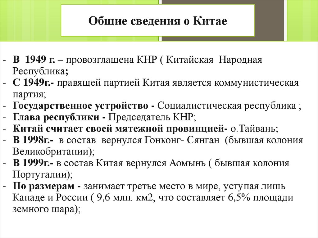Общие сведения о Китае- В 1949 г. – провозглашена КНР ( Китайская Народная