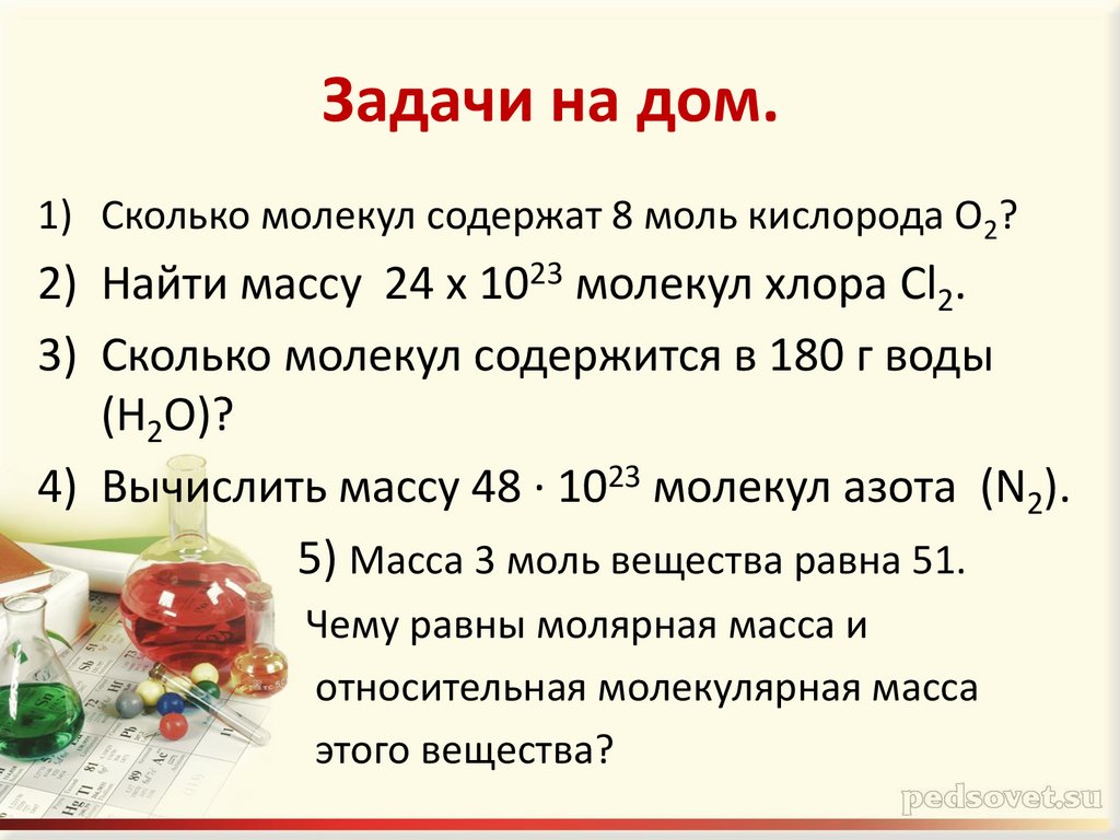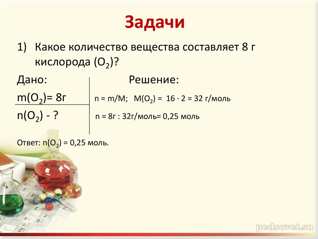 Задачи на дом.1) Сколько молекул содержат 8 моль кислорода О2?