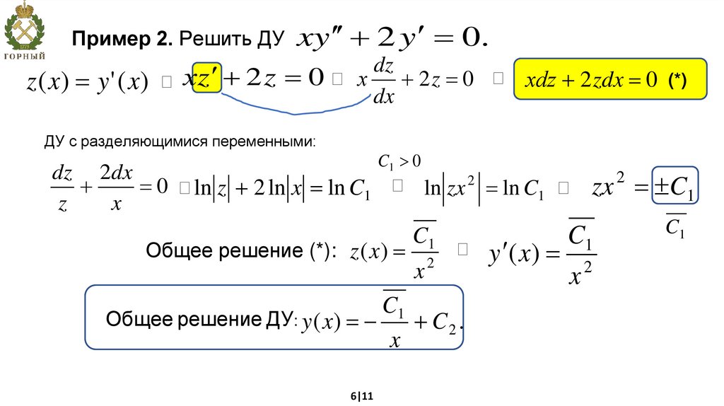 Пример 2. Решить ДУ xy 2 y 0.z ( x) y ' ( x)