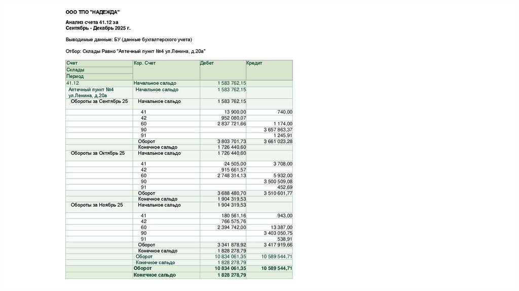 ООО ТПО "НАДЕЖДА"Анализ счета 41.12 за