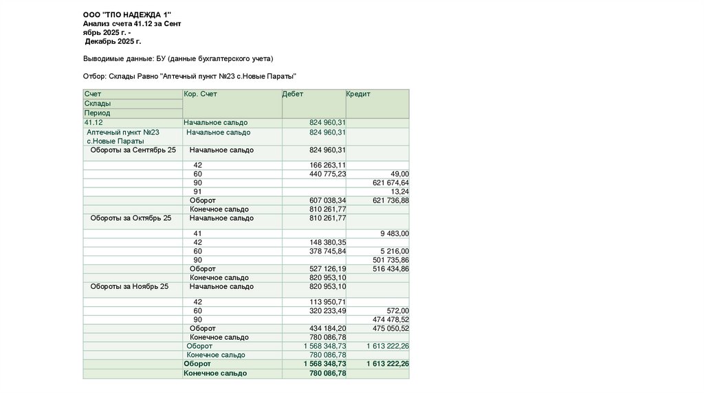 ООО "ТПО НАДЕЖДА 1"Анализ счета 41.12 за Сент