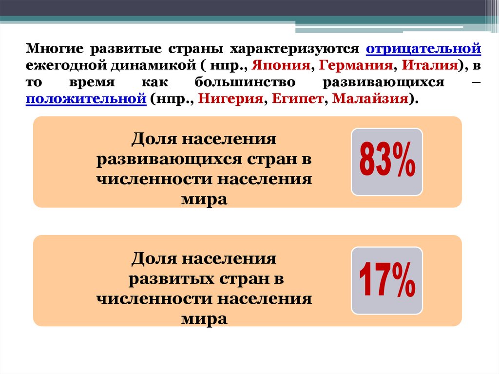 Многие развитые страны характеризуются отрицательнойежегодной динамикой ( нпр., Япония, Германия, Италия), в