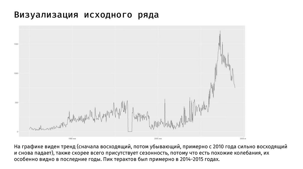 Визуализация исходного рядаНа графике виден тренд (сначала восходящий, потом убывающий, примерно с 2010 года сильно восходящий